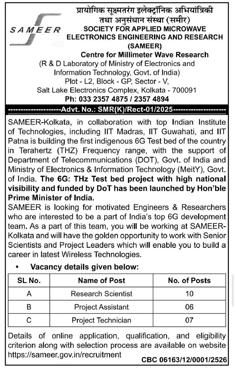 The Society for Applied Microwave Electronics Engineering and Research (SAMEER) has announced the SAMEER Recruitment 2025 for 23 vacancies in various technical positions including Research Scientist, Project Assistant, and Project Technician.