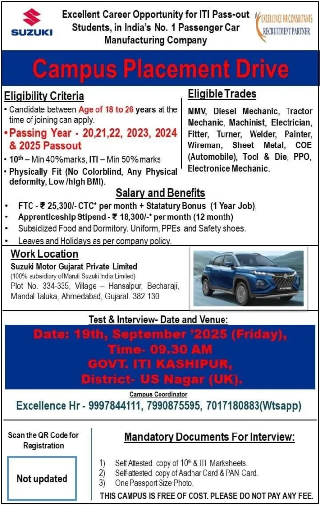 Are you an ITI pass candidate looking for high-paying opportunities in the automobile sector? Suzuki Motor Gujarat Private Limited has announced its Campus Placement Drive 2025 for multiple technical trades including Motor Mechanic, Diesel Mechanic, Fitter, Welder, Electrician, and more. The walk-in recruitment drive will be held on 24 September 2025 at Government ITI Nagpur, South Ambazari Road. This is a golden chance for skilled candidates to build a career with Suzuki Motors, a 100% subsidiary of Maruti Suzuki India Limited.